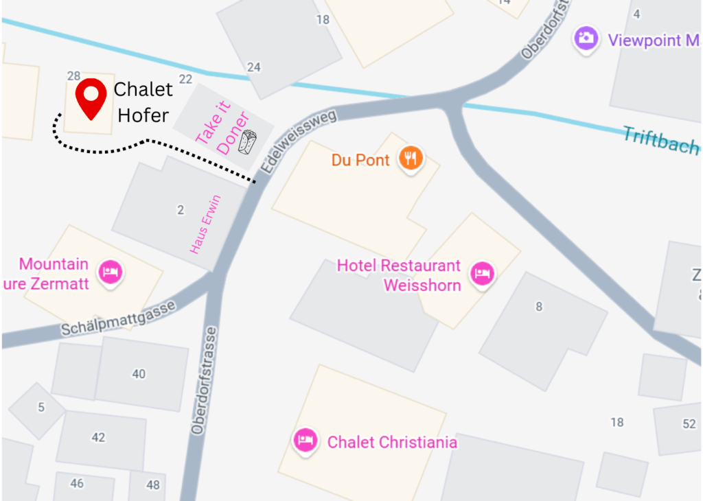 From the station you have to go to Chalet Hofer, Oberdorfstrasse 28, 3920 Zermatt, or here on google maps.