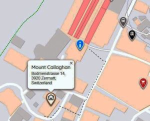 For the Mount Callaghan apartment, from the station you need to go to Haus Nevada, Bodmenstrasse 14, 3920 Zermatt, or here on google maps