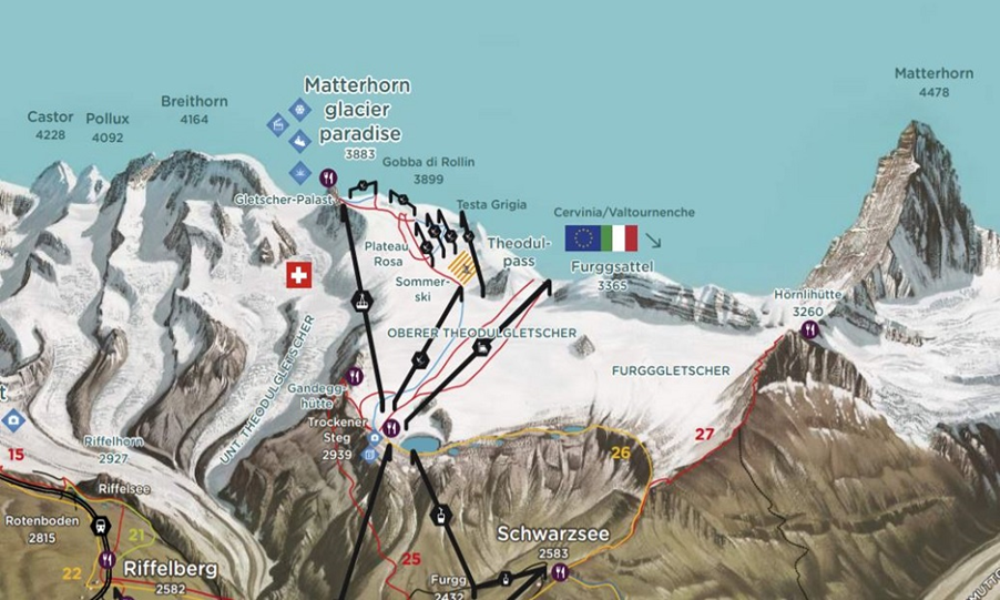 - Ski: Zermatt has a great summer ski area around the Klein Matterhorn, you can rent equipment in the village, and book lessons. Open from 08:30 (06:30 in July/ August) to 13:00. Last lift up for skiers is at 11:20. The best snow is from 10:30 – 12:30, it can be icy earlier.
