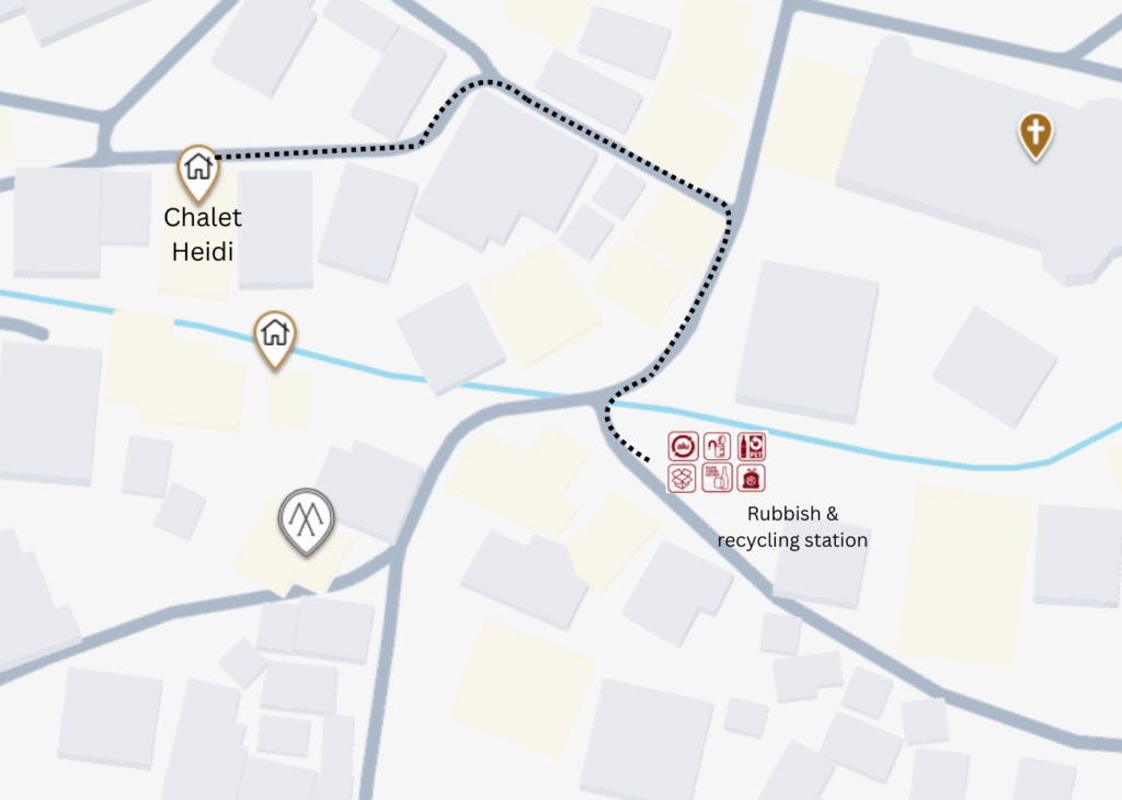 Below you can see the closest waste disposal point to Chalet Heidi, after the bridge by Restaurant Weisshorn, turning right when getting down to the Church Square.
