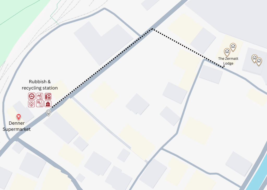 Below you can see the closest waste disposal points to the Zermatt Lodge, which are on the main street, turning left when you get onto it.