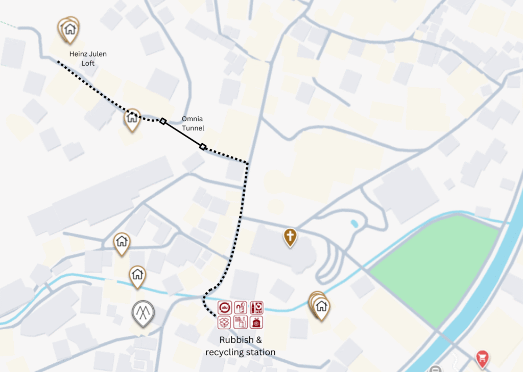 The closest waste disposal point to the Heinz Julen Loft is opposite the Weisshorn Hotel, just past the church square. Turn right as you come out of the Omnia tunnel and path.
