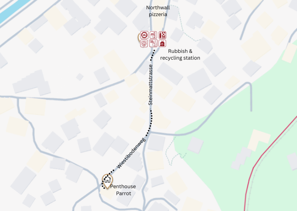 Below you can see the closest waste disposal points to Chalet Parrot, which is down the small pathway next to the house and walk towards The North Wall bar.