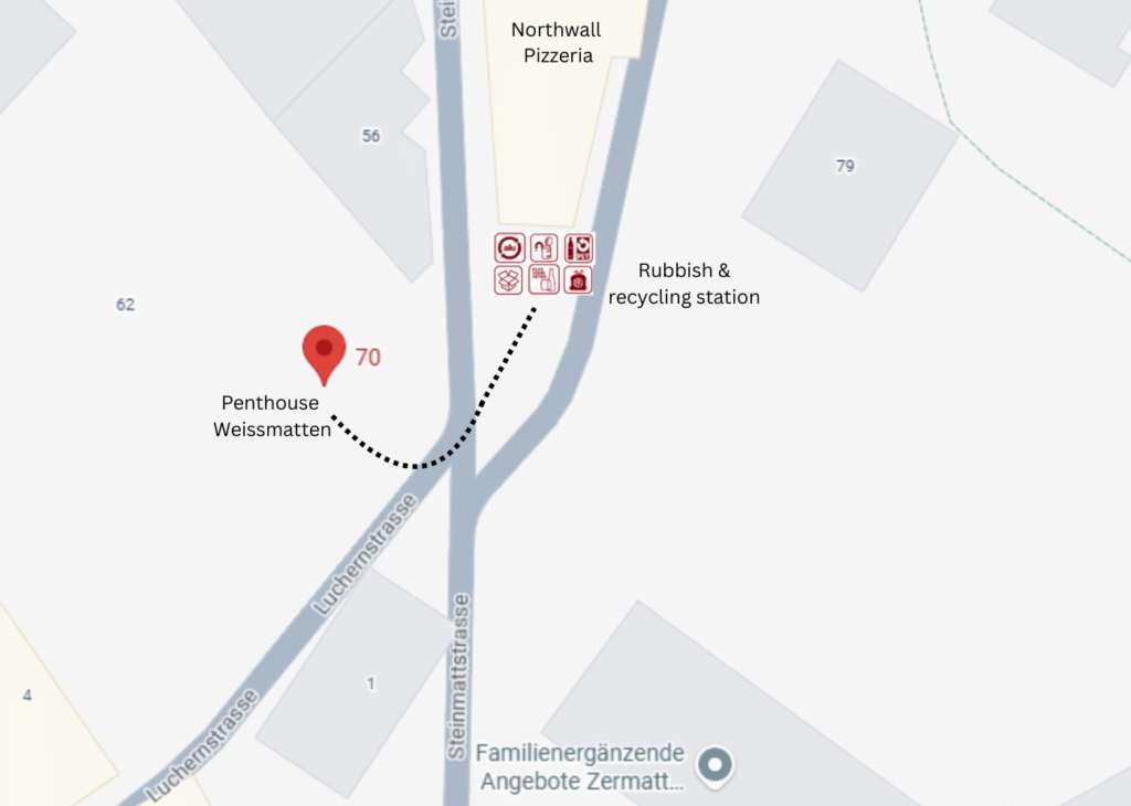 Below you can see the closest waste disposal points to Penthouse Weissmatten, which is in front of The North Wall bar.