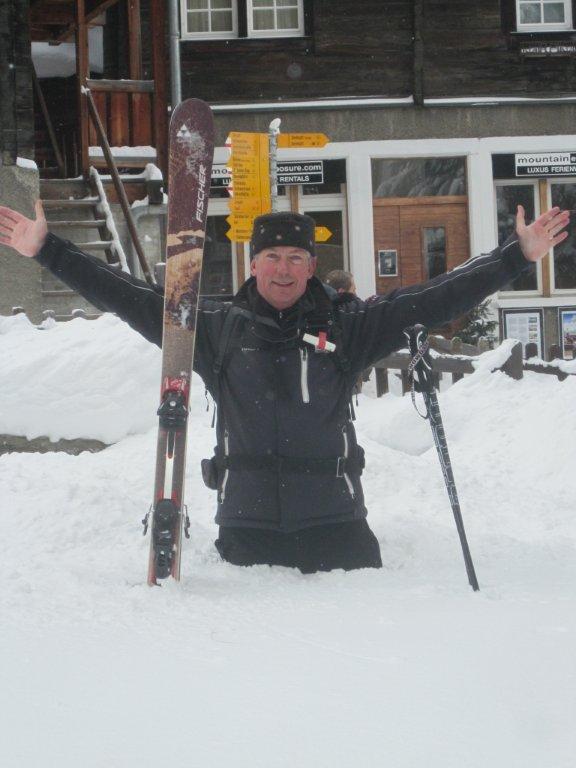 The gourmet ski guide in front of the Mountain Exposure office after a big lunch: