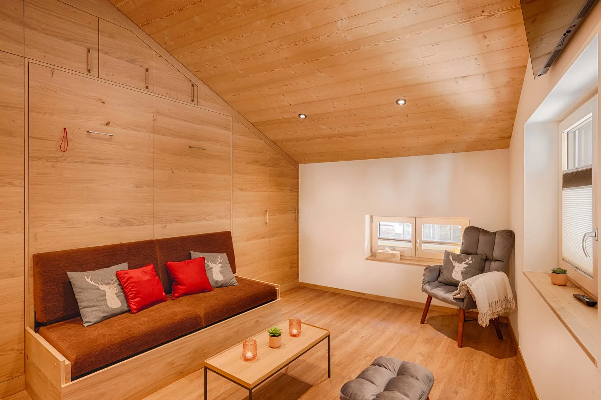 Réparti sur deux étages, le chalet vous accueille par une entrée privée dans une cuisine lumineuse et bien pensée avec un coin repas, qui s’ouvre sur un salon douillet et confortable. À l’étage, la chambre est astucieusement conçue pour se transformer en un espace salon supplémentaire, avec un lit double de haute qualité qui se replie pour révéler un canapé intégré.