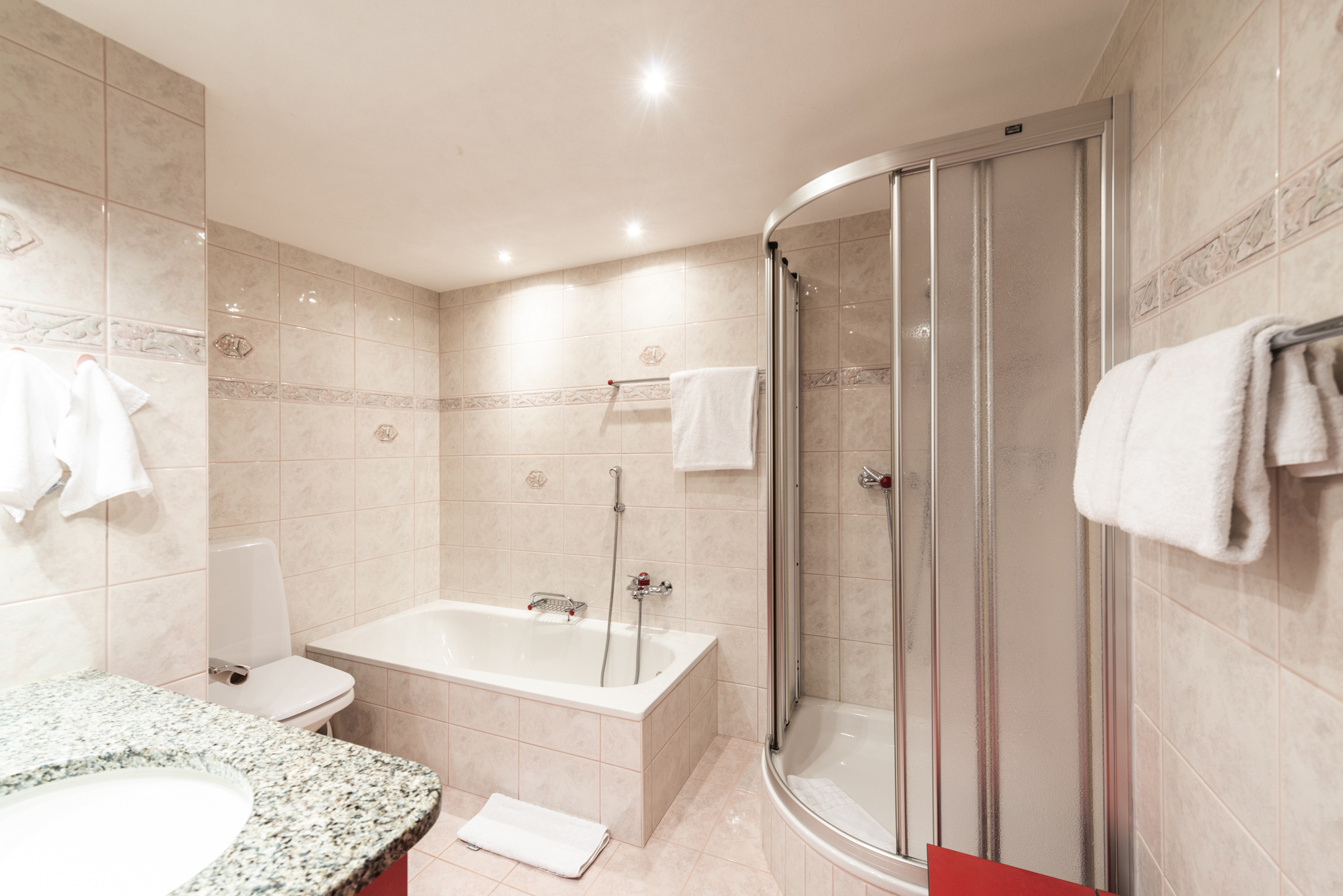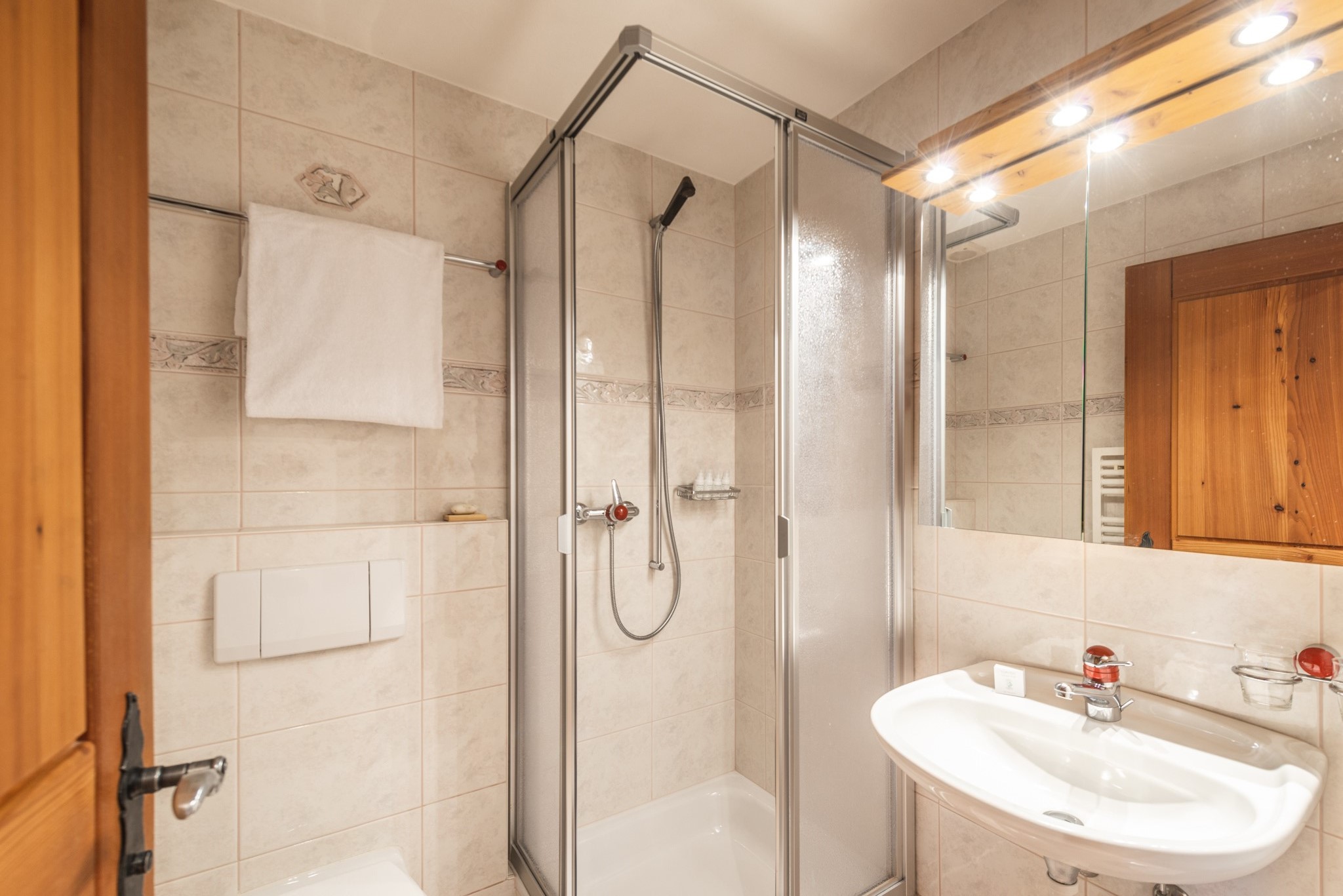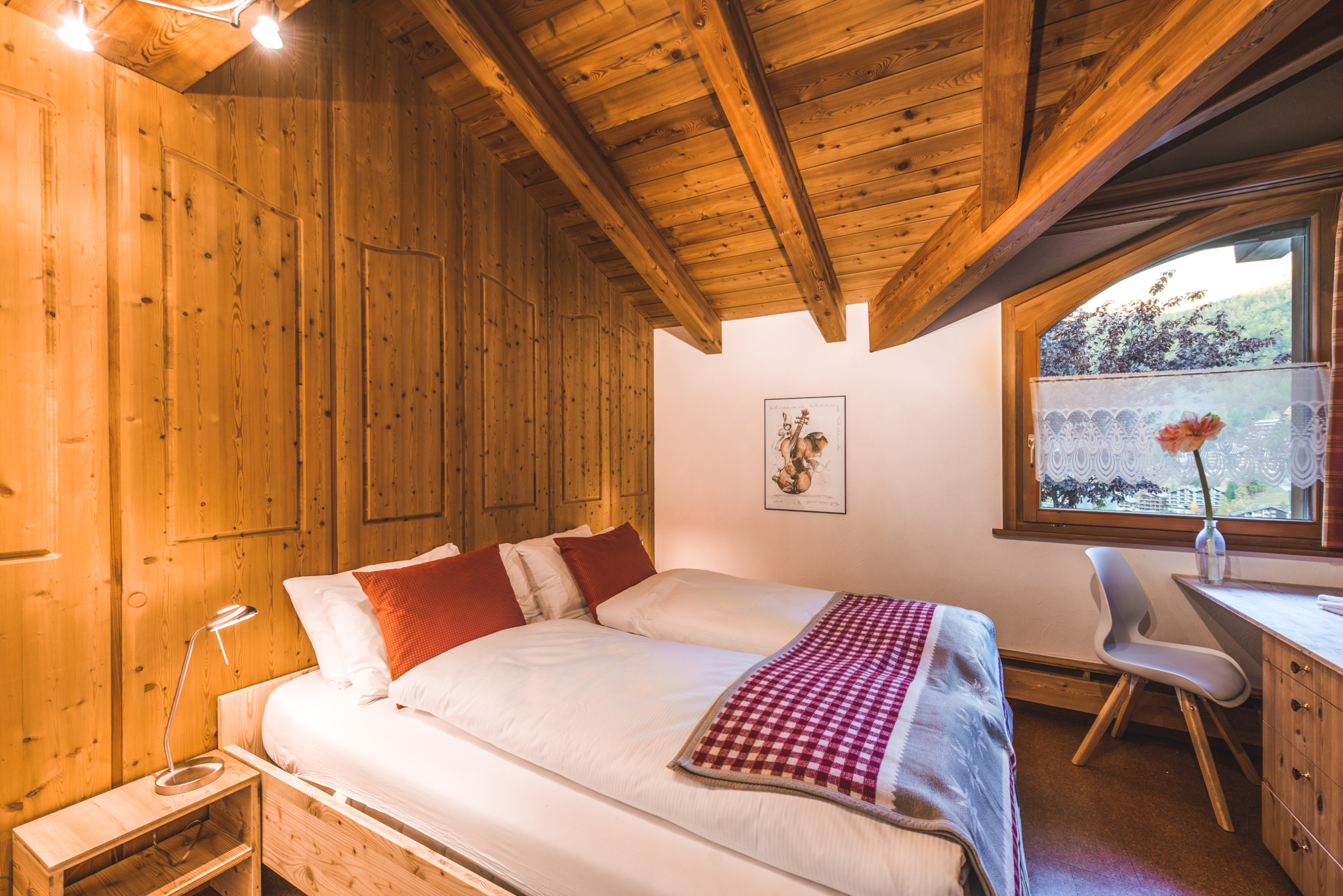 Le chalet est très bien situé, perché sur une colline surplombant l’église principale et la rue. En raison de sa position surélevée, on y accède par un chemin relativement escarpé: depuis la rue principale, il s’agit d’une montée de 24 mètres verticaux sur une distance de 290 mètres. Il n’y a pas d’accès par ascenseur, mais le point de chute des taxis le plus proche se trouve à côté de l’église anglaise, ce qui réduit la montée à 15 mètres verticaux. C’est pourquoi nous recommandons ce chalet aux personnes sportives et en bonne forme physique. Il ne convient pas aux personnes âgées ni aux enfants en bas âge.