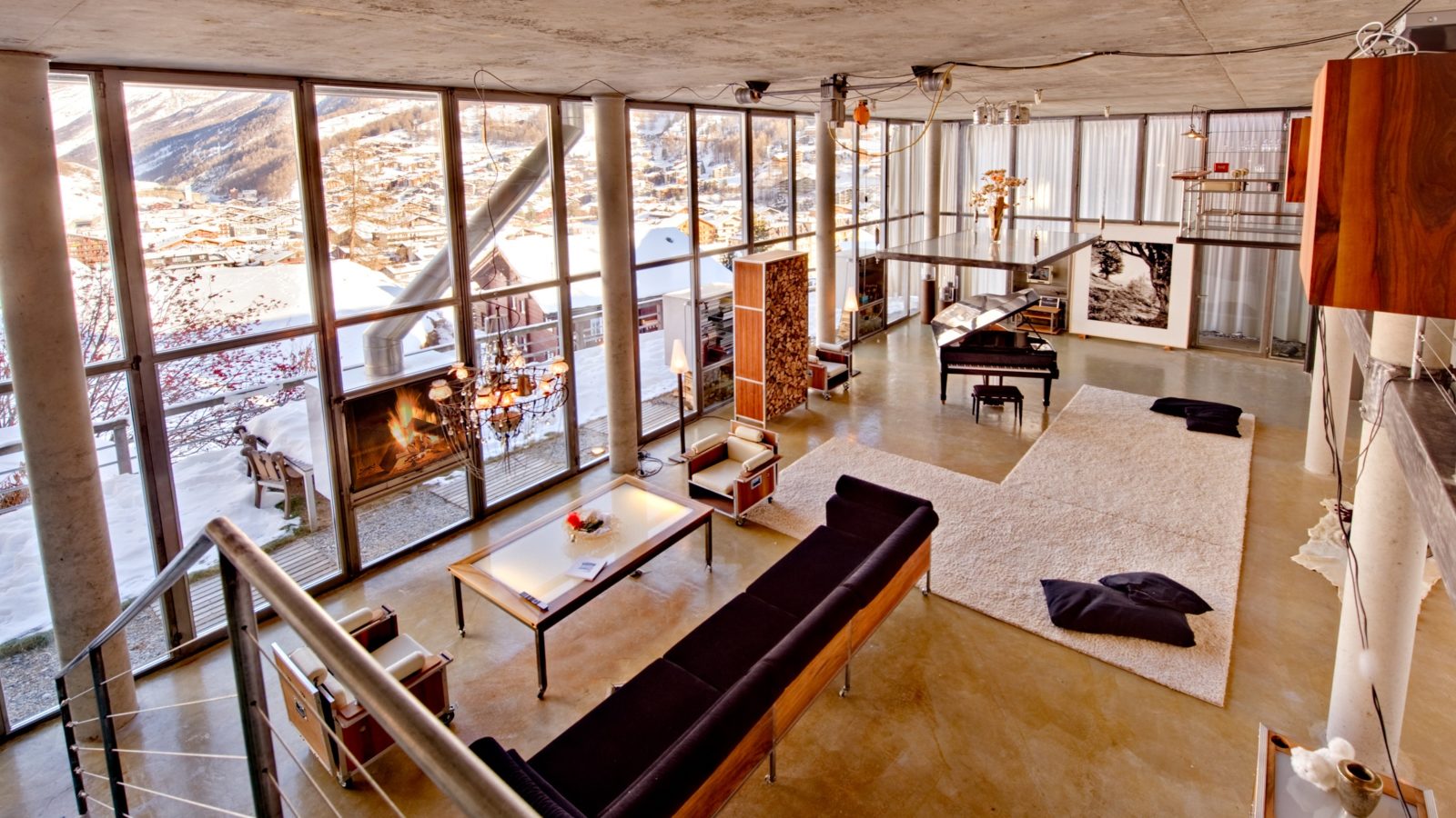 Dans un coin, on peut jouer sur un piano Steinway à queue, tandis que dans un autre, on peut s’enfoncer dans un grand canapé et contempler simultanément la vue imprenable sur le village et la cheminée crépitante encastrée dans la paroi vitrée.