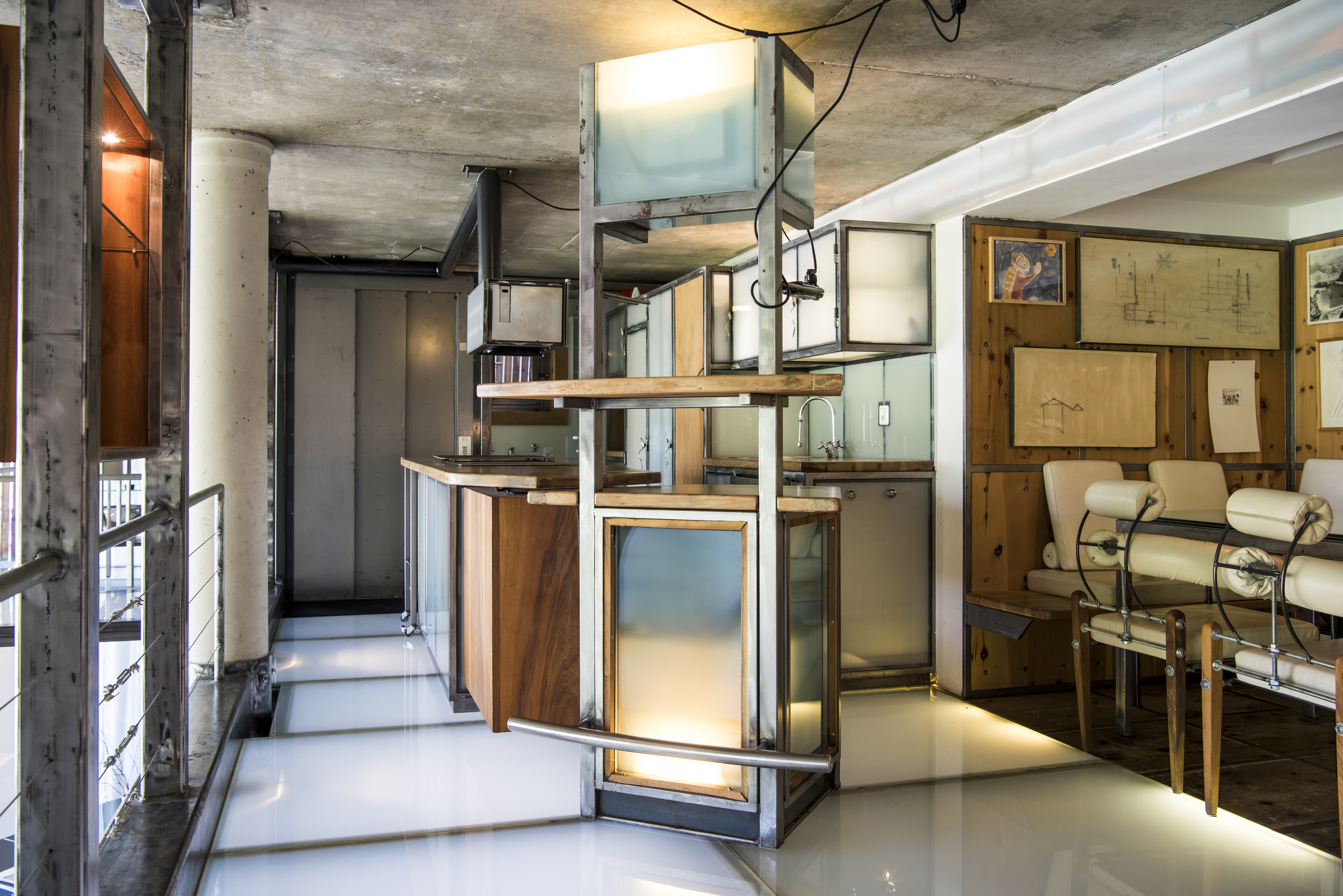 Autour de vous : deux bureaux, des fauteuils « jack-in-the-box », un mur d’art et un lustre signé Heinz Julen. En fait, tous les meubles recherchés du Loft ont été conçus par Heinz. Les deux niveaux du Loft sont desservis par un ascenseur privé.