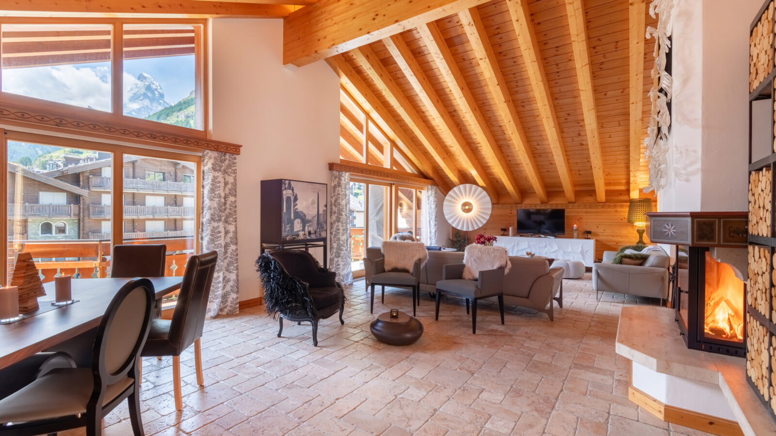 Un penthouse de 230 m2 profondément luxueux, raffiné et élégant, situé en plein cœur de Zermatt, avec une vue splendide sur le Cervin et le village. Il est situé dans une rue latérale tranquille, à proximité de la gare centrale, du chemin de fer de montagne Gornergrat et du centre commercial Coop.