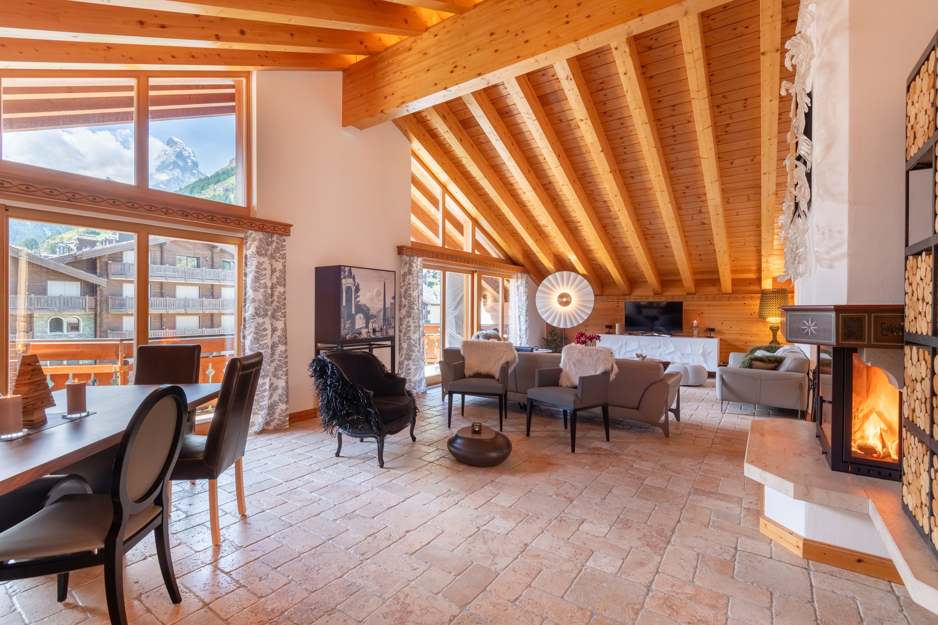 Un penthouse de 230 m2 profondément luxueux, raffiné et élégant, situé en plein cœur de Zermatt, avec une vue splendide sur le Cervin et le village. Il est situé dans une rue latérale tranquille, à proximité de la gare centrale, du chemin de fer de montagne Gornergrat et du centre commercial Coop.