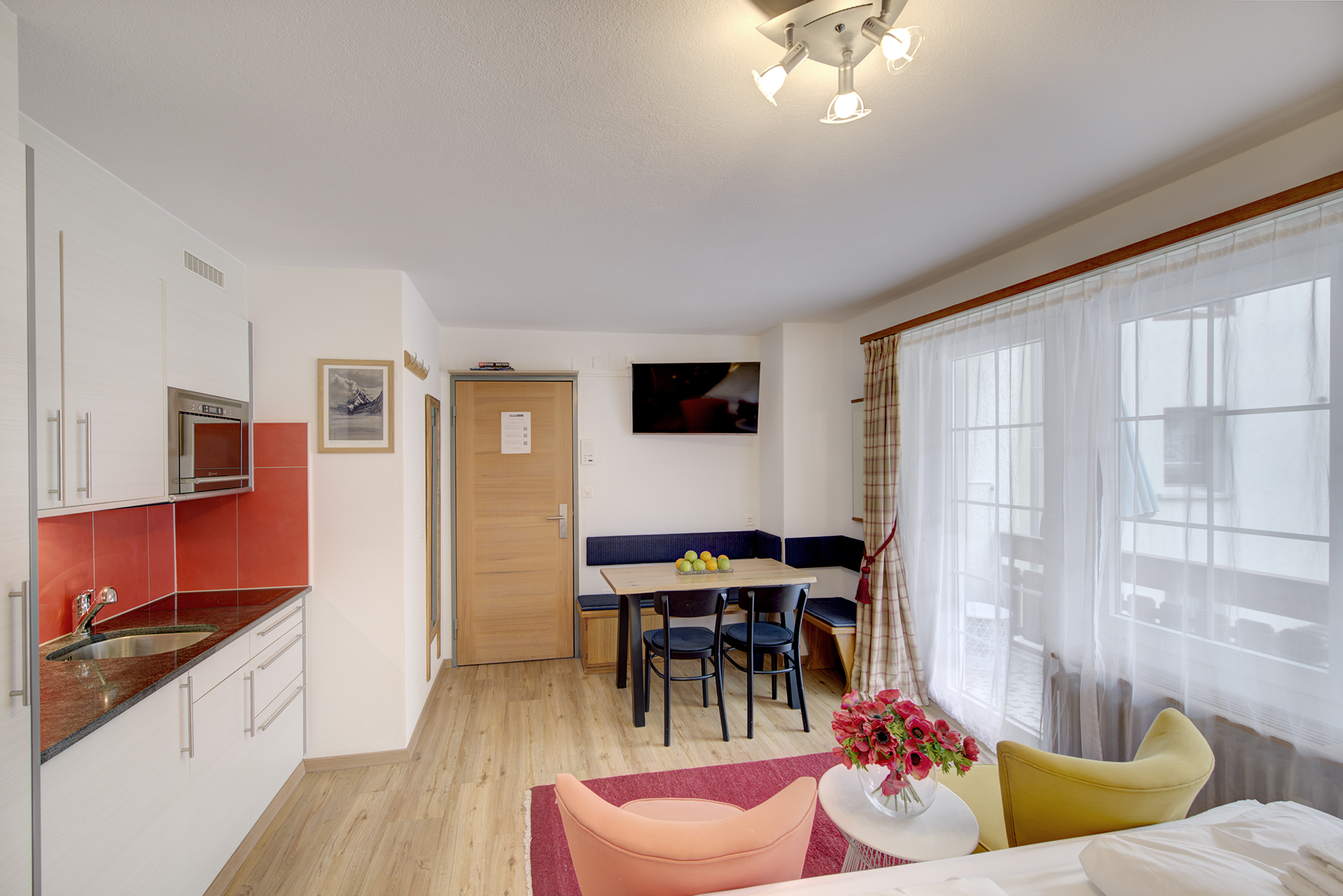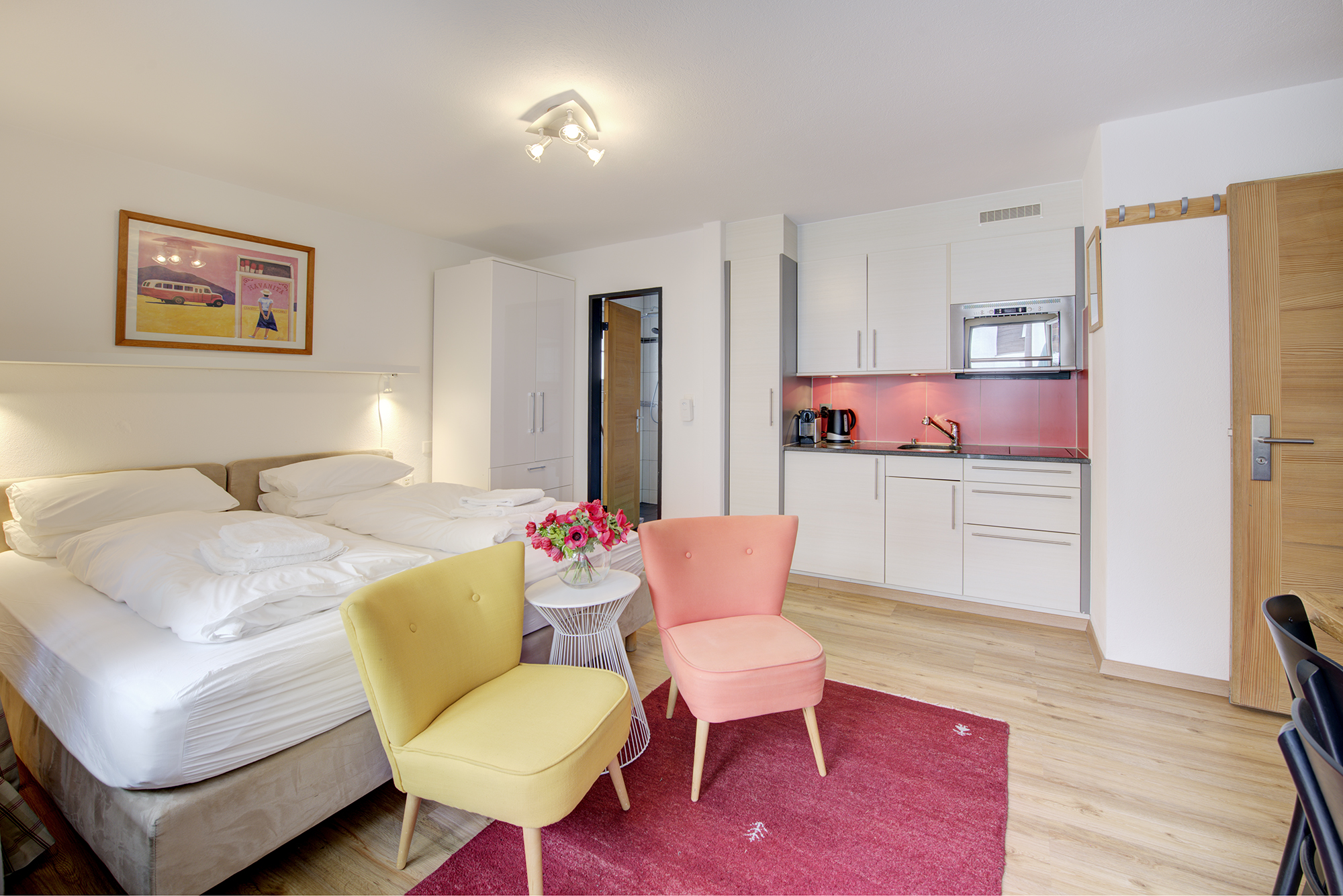 Le studio Lil (23 m²) dispose d’un grand balcon orienté à l’ouest avec vue sur un ruisseau de montagne, les gorges de Trift et la cabane Edelweiss. Il dispose de la plus grande salle de bains des trois studios, avec une douche à l’italienne. Le lit peut être configuré comme un lit double ou deux lits jumeaux. La kitchenette, avec ses surfaces en granit noir, est équipée de tout ce dont vous pourriez avoir besoin pour vos nuits. La télévision à écran plat dispose de plus de 150 chaînes avec des programmes en plusieurs langues, dont l’anglais, que vous pouvez regarder depuis les fauteuils moelleux et confortables.