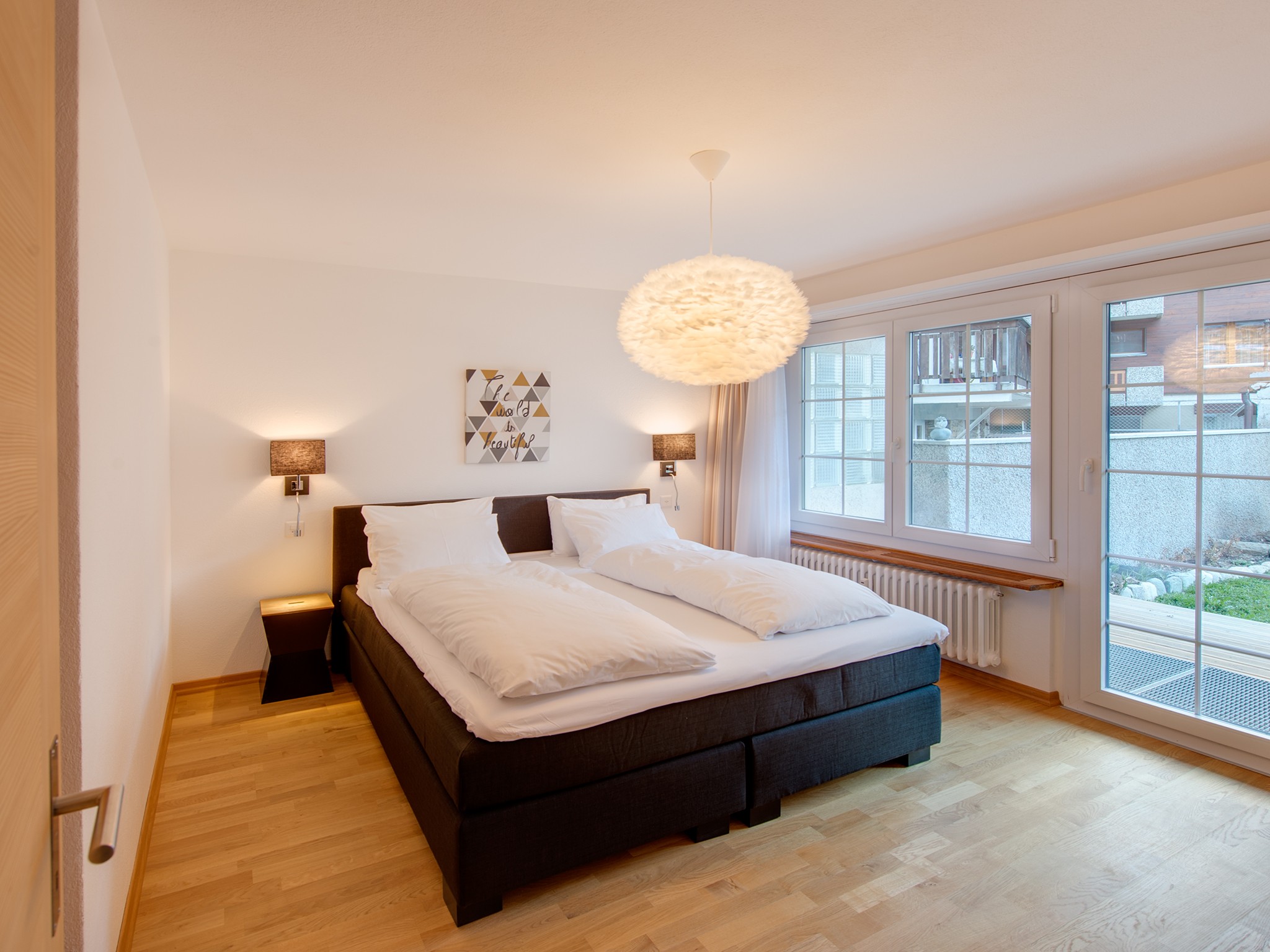 Il y a deux chambres doubles (dont une avec des matelas jumeaux), tandis que la troisième chambre a deux lits simples qui peuvent être poussés l’un contre l’autre. Il n’y a qu’une seule salle de bains, avec une baignoire, une douche séparée et des toilettes.
