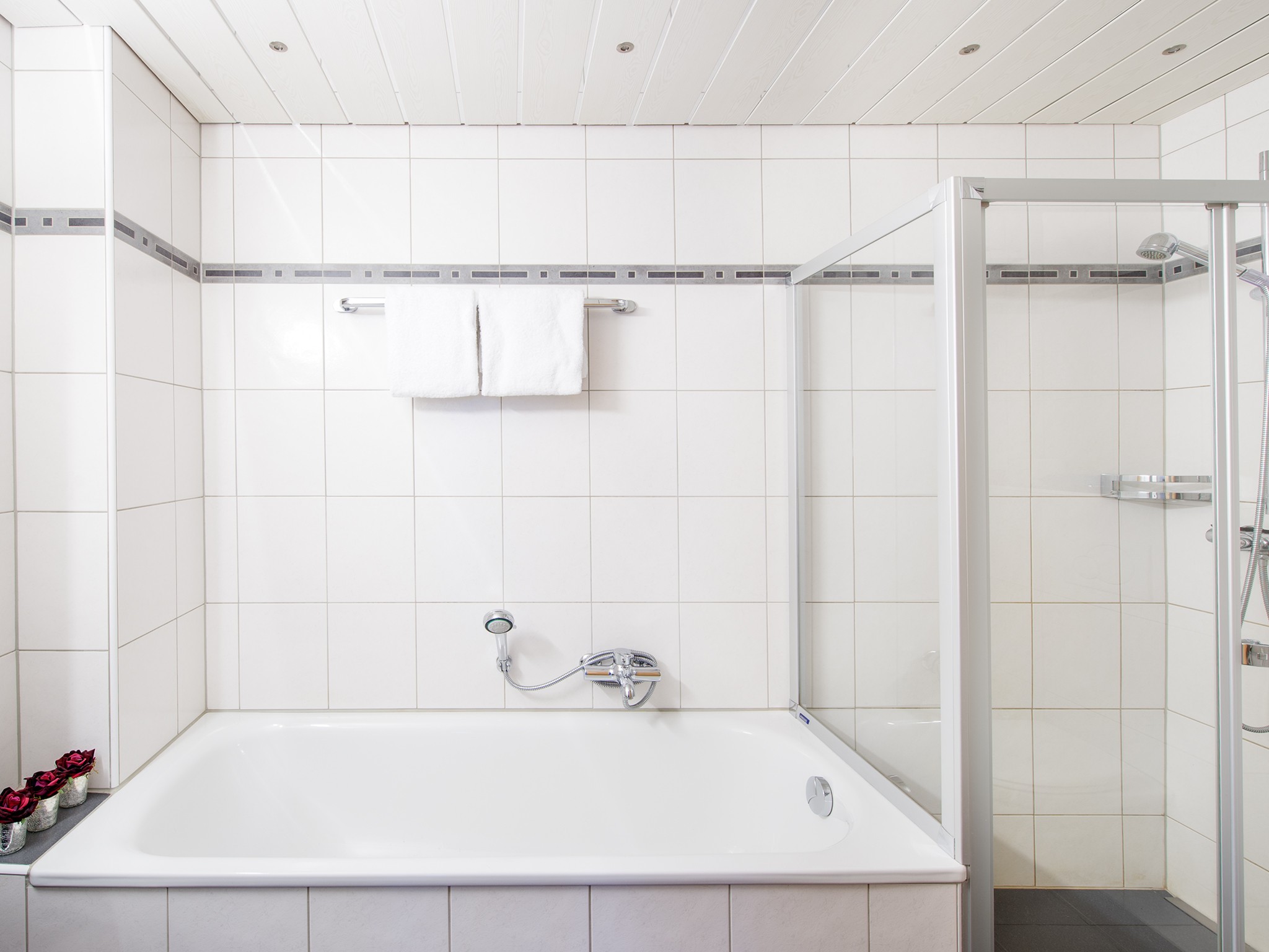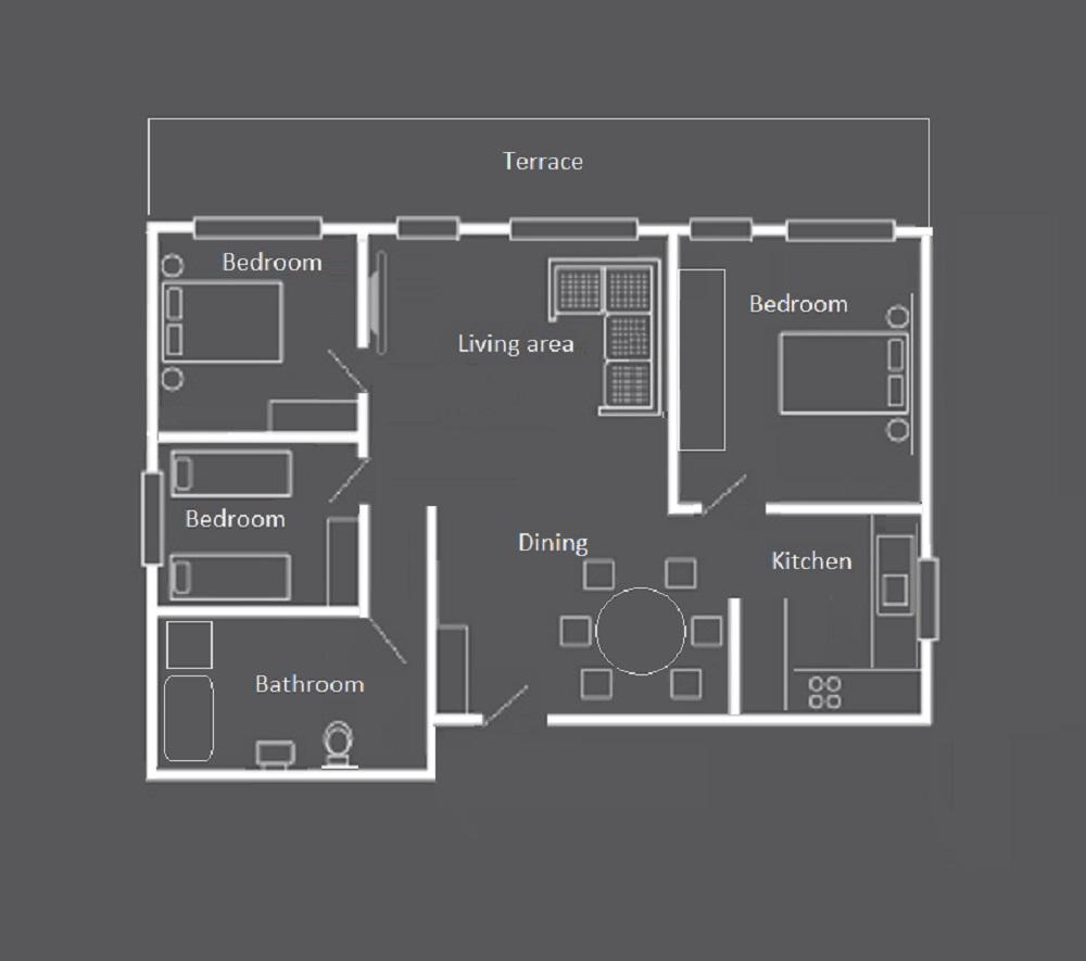 Il y a deux chambres doubles (dont une avec des matelas jumeaux), tandis que la troisième chambre a deux lits simples qui peuvent être poussés l’un contre l’autre. Il n’y a qu’une seule salle de bains, avec une baignoire, une douche séparée et des toilettes.