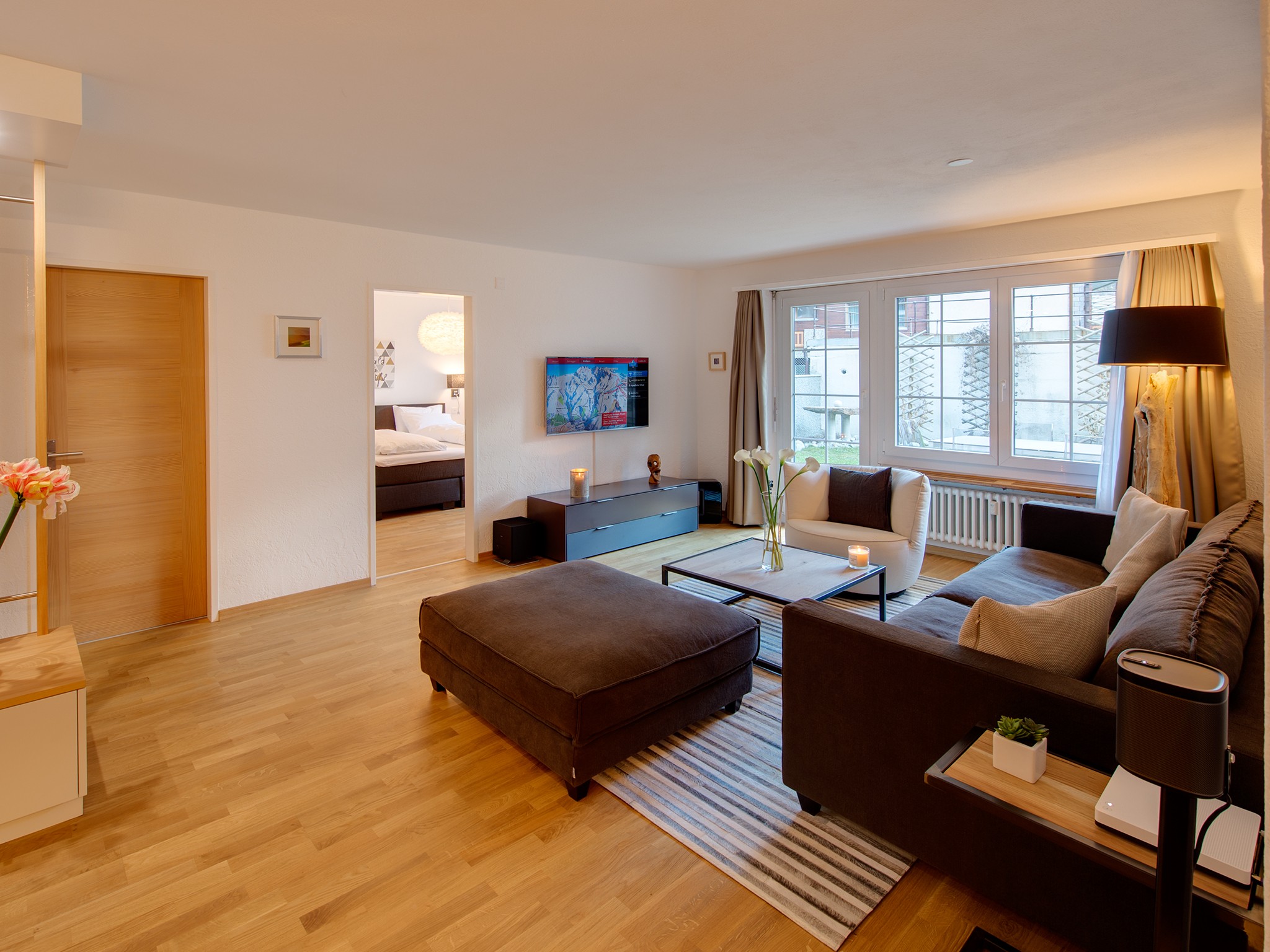 L’appartement de vacances de Zermatt Vieux Moulin – Old Mill House – Garden Apartment est un appartement de jardin lumineux de 95 m² avec trois chambres à coucher qui donne sur sa propre pelouse et sa terrasse orientée au sud avec vue sur le Cervin.
