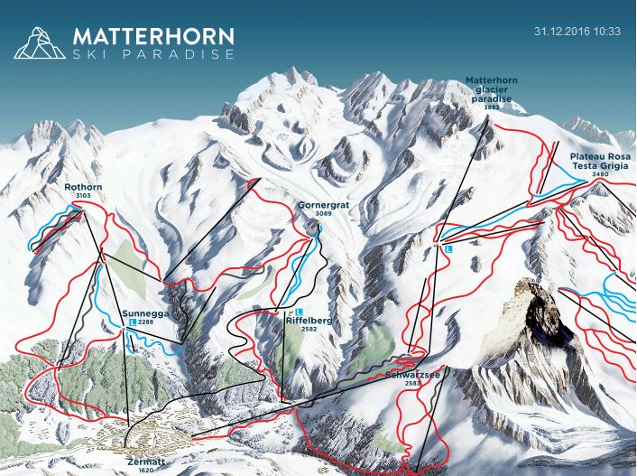 We have had a beautiful week of high pressure weather with clear skies and sunshine. The skiing conditions on piste are still good, especially above 2,200m and on the Italian side. Below this the snow is man-made and somewhat harder. These are typical Christmas week conditions with not much off-piste; however unlike many resorts Zermatt is blessed with a reasonable amount of snow so the majority of runs are open as you can see from the map below.