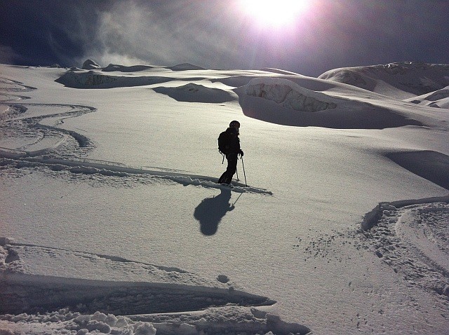 A Mountain Exposure client catching her breath on the Schwarztor, April 2013: